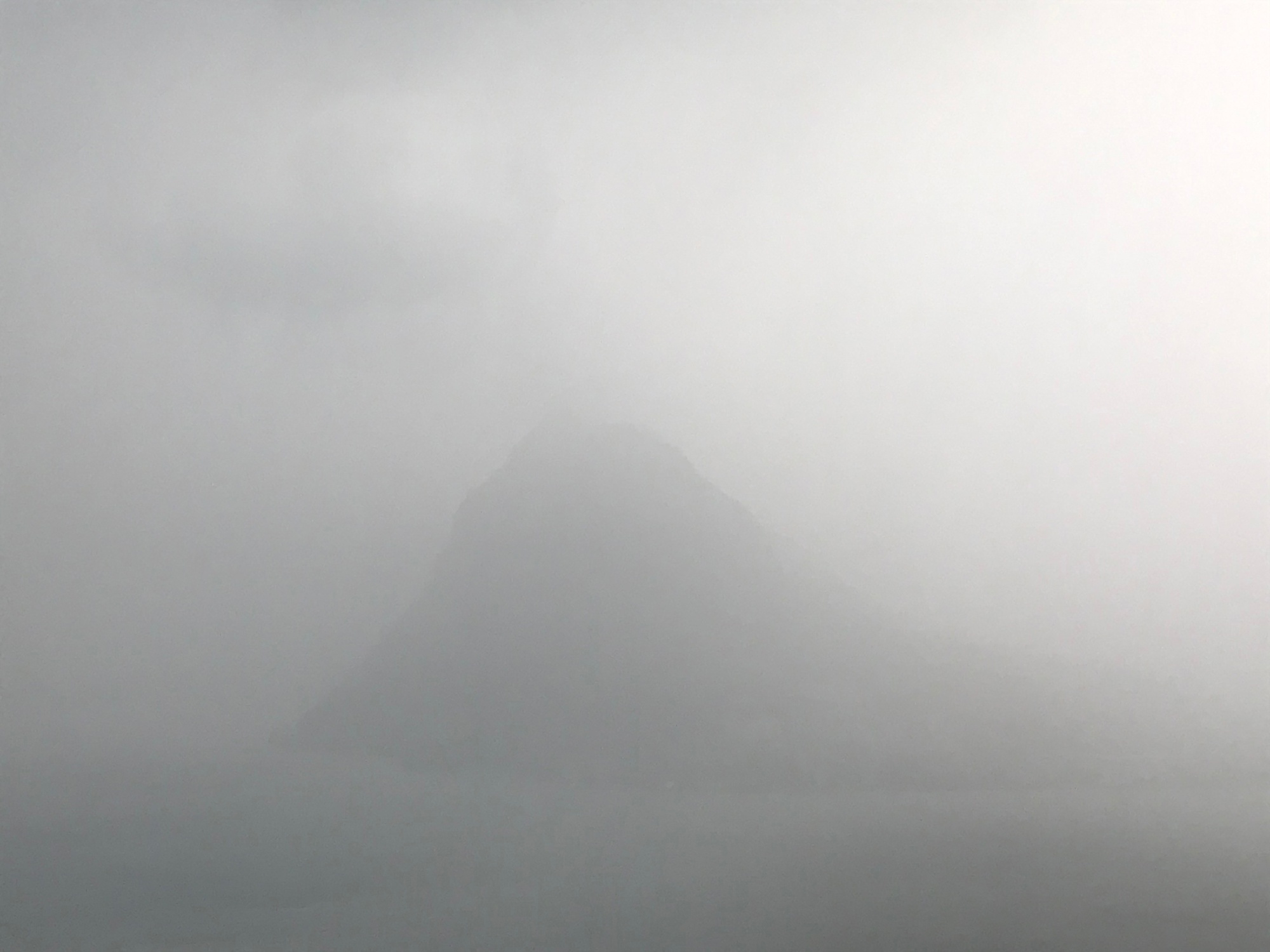 View from the construction site looking towards Lake Lugano and the San Salvatore mountain, on a foggy winter day.