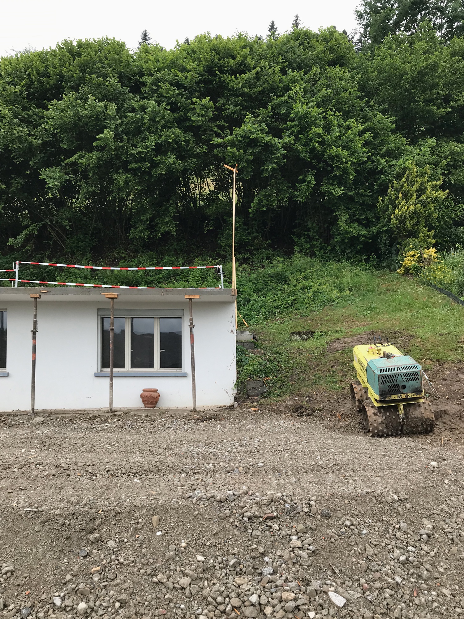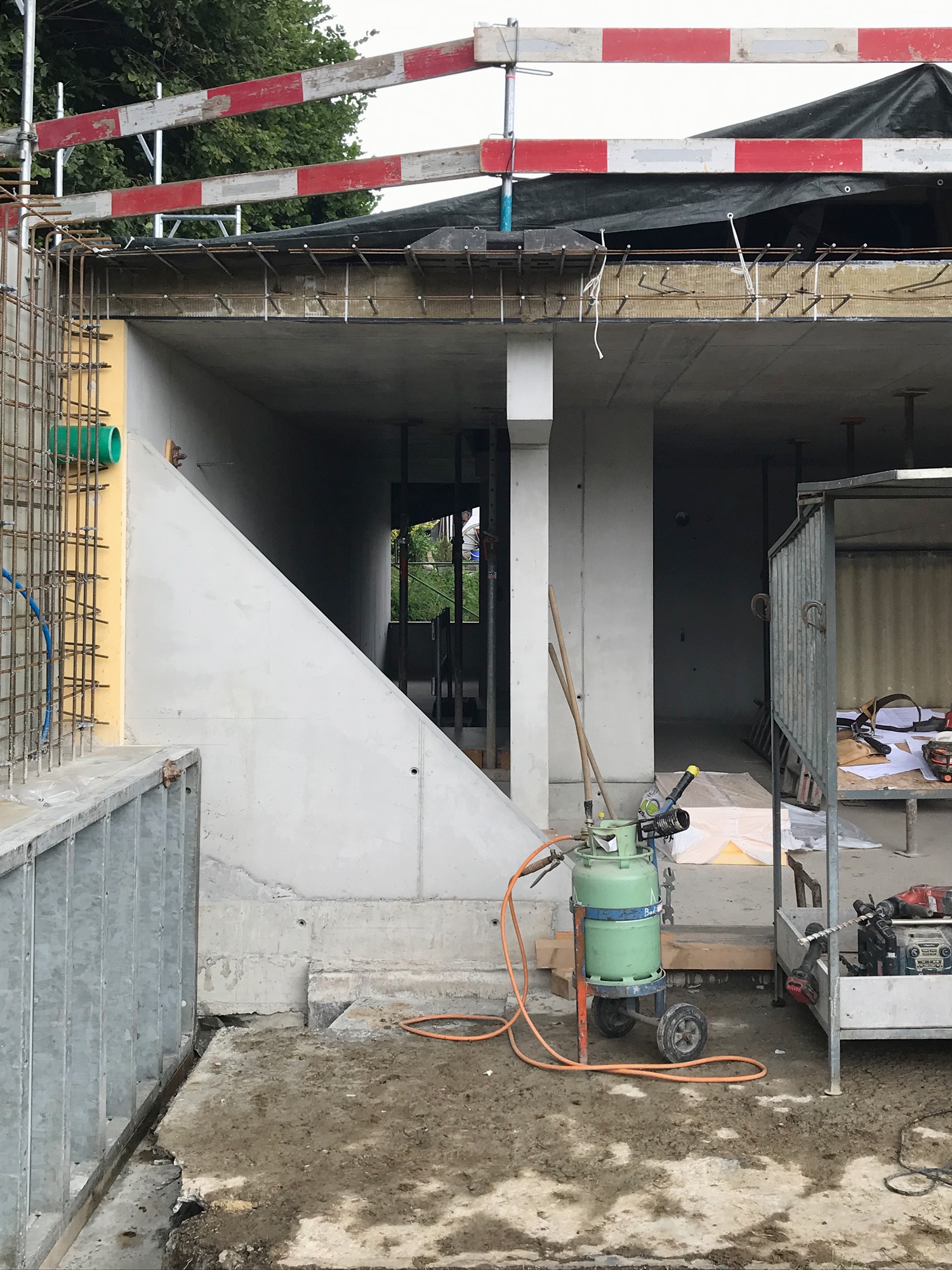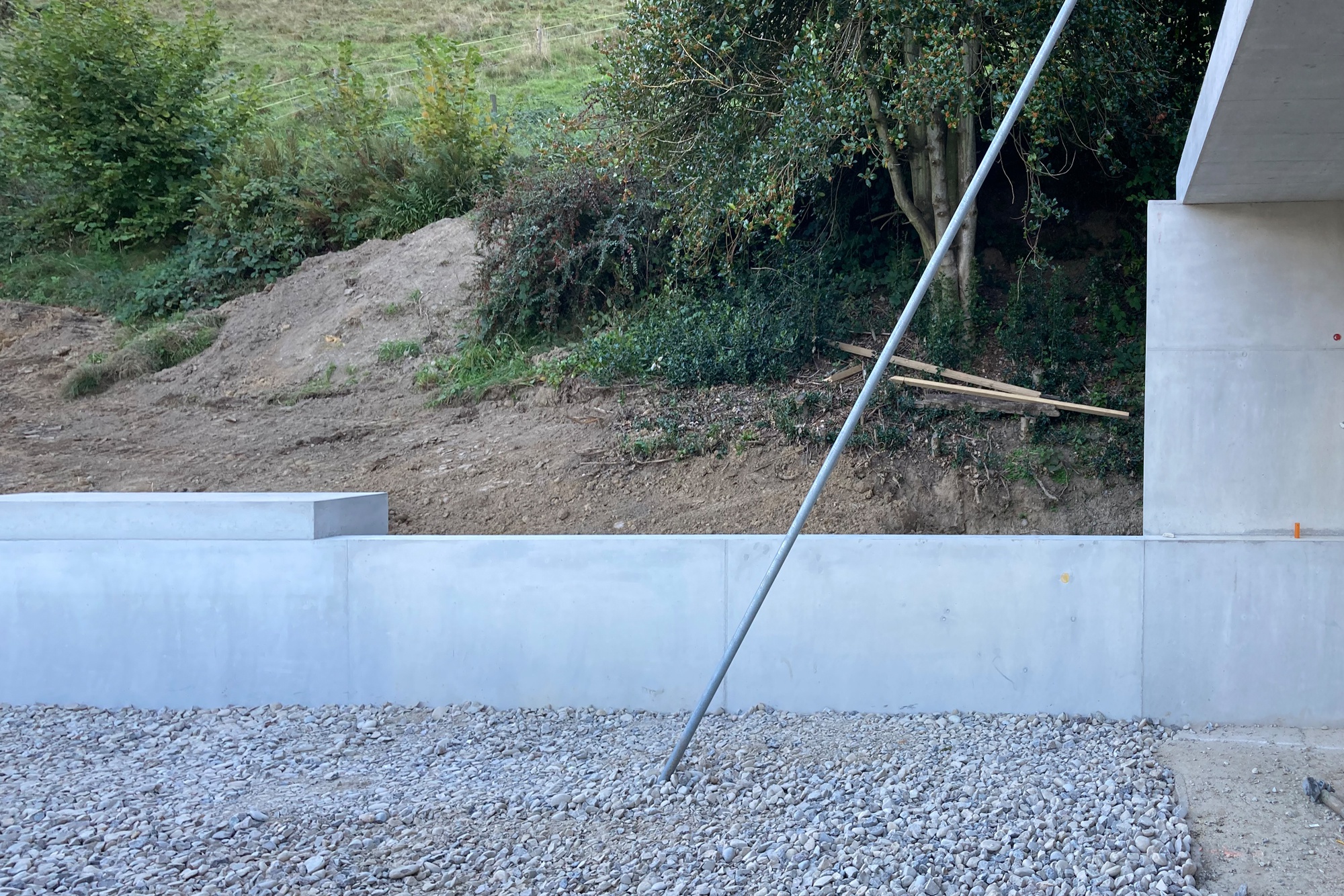 After a quick design process, we are happy to start the construction site of «House on a slope». The old building present on the lot was demolished until its base. The existing concrete volume - including entrance's foyer, garage, cellar and technical rooms - is kept unchanged. On top, we are placing a new two story building out of concrete and wood.