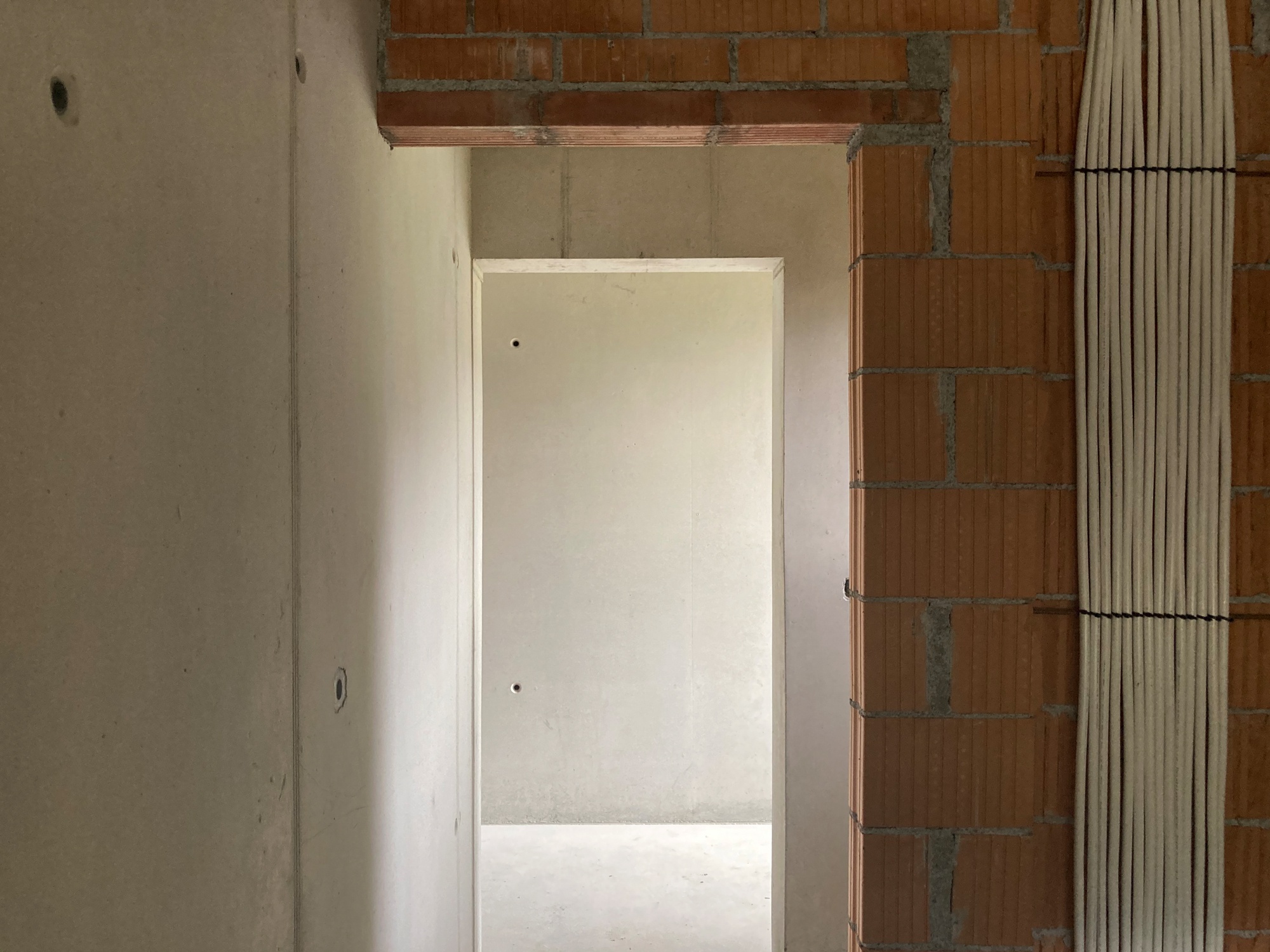 The construction reached the upper floor, where the first concrete walls were cast. Through a side window the light flows in the long corridor in the back of the building.