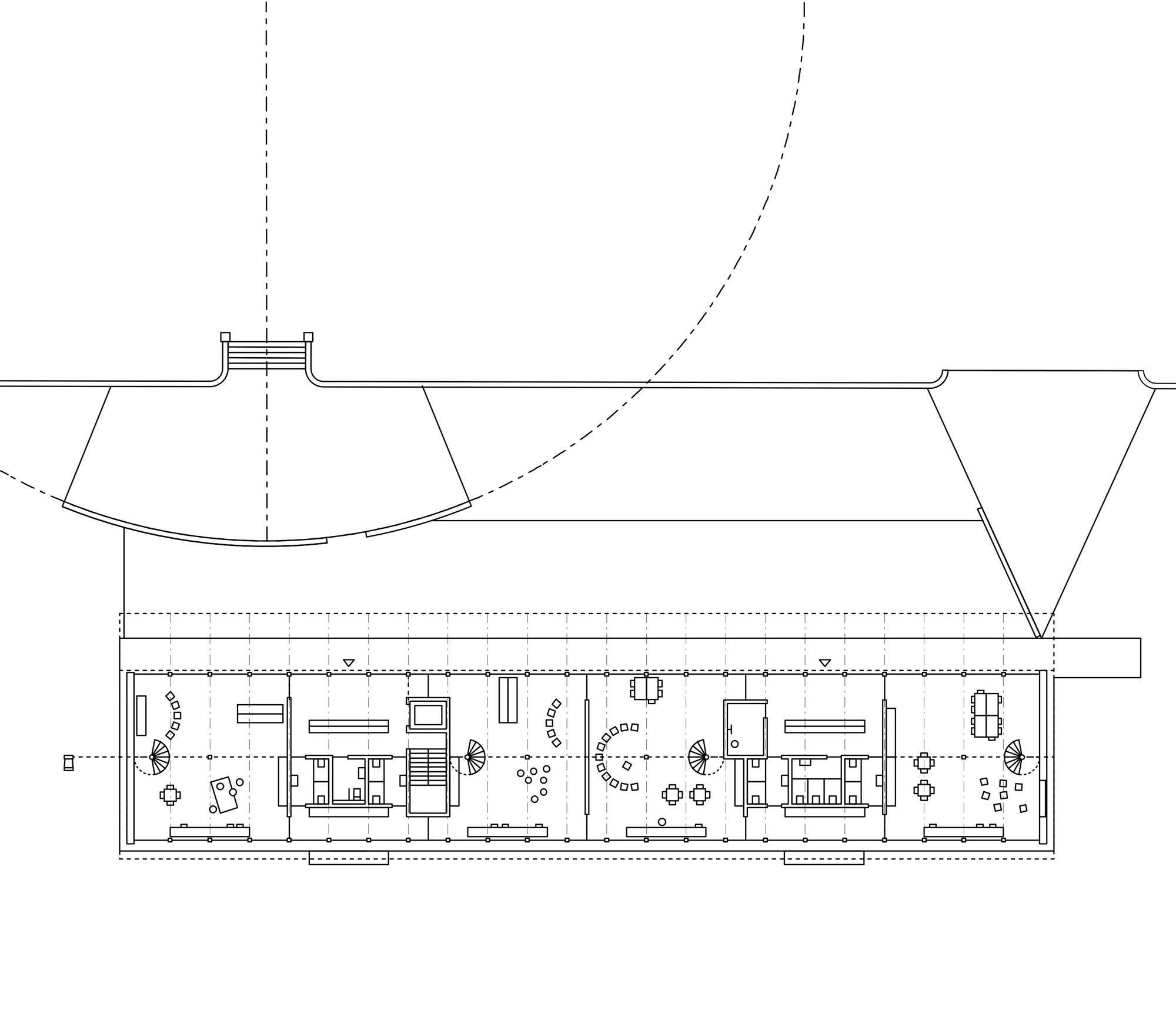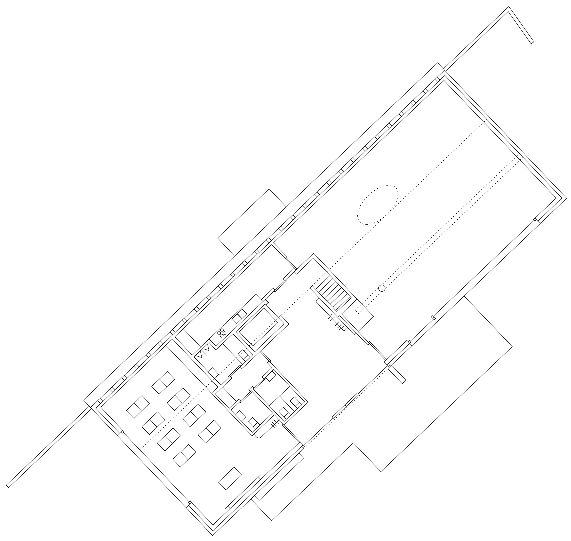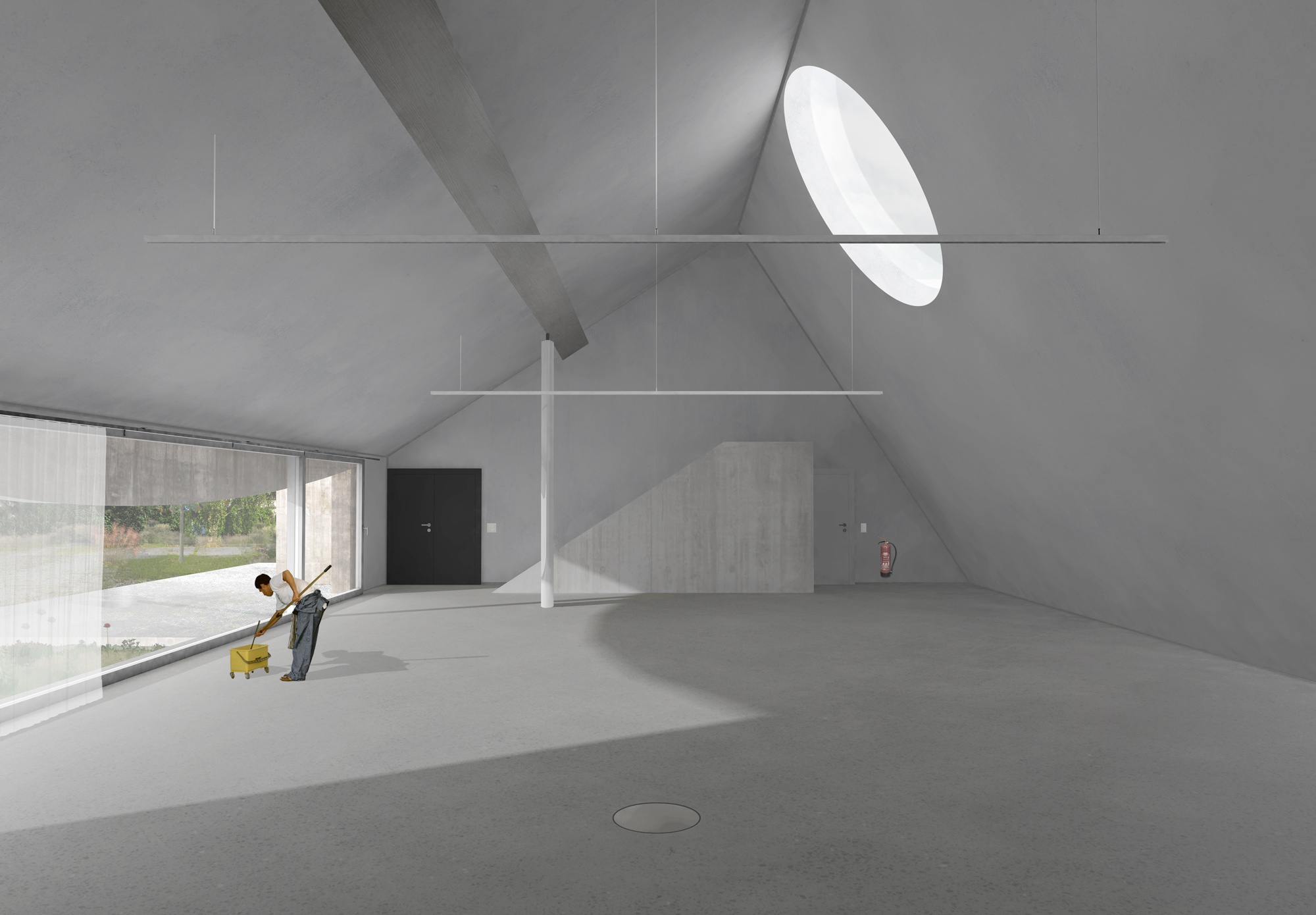 The roof construction is dimensioned for to the small spans present in most of the building’s rooms. In the main event space, the structural possibilities of this simple and rational construction are exceeded. Here, two additional elements - a beam and a pillar - support the roof, create a reference point and generate a feeling of monumentality in the space.