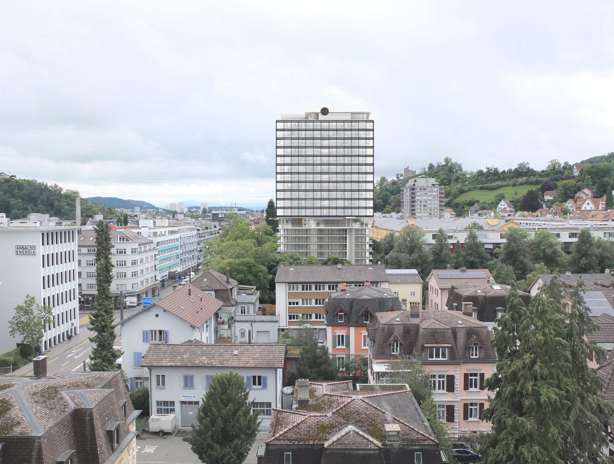 Placed along a main street leading into Baden, the multifunctional tower marks the limit between the agglomeration an the city center. The lower part of the building relates to the urban structure, offering flexible spaces for offices and various public functions. With its top part, fitting 11 floors of apartments, the 70m high tower acts as a new landmark for the city. An open floor marks the gap between the two parts of the tower, offering a space for recreation to the inhabitants.
