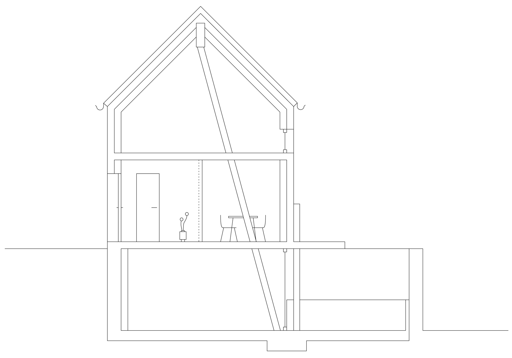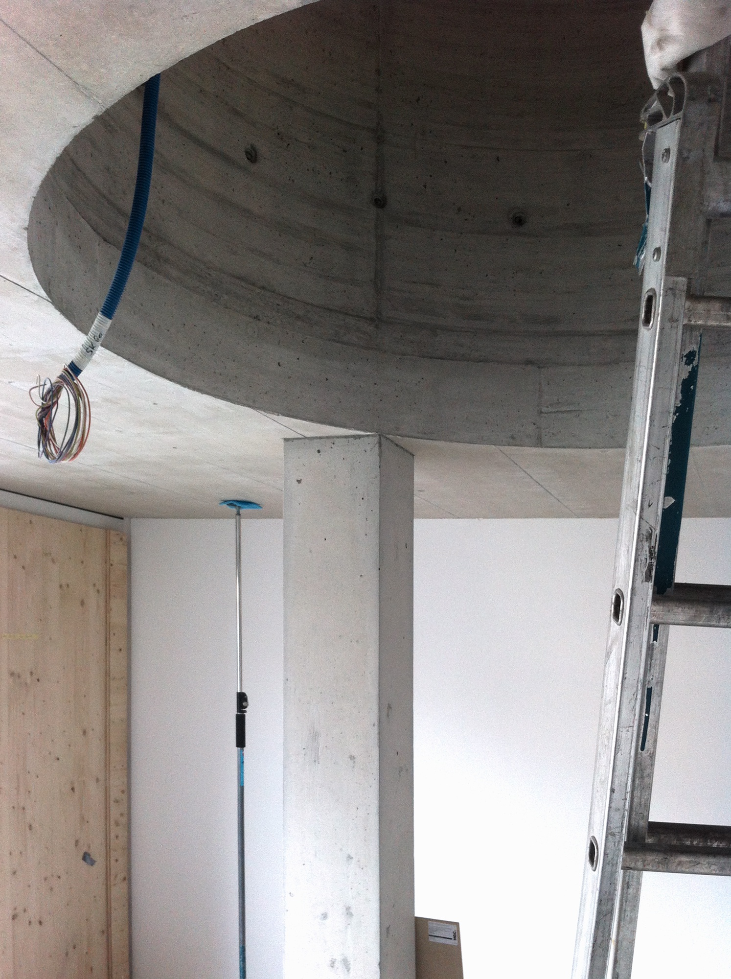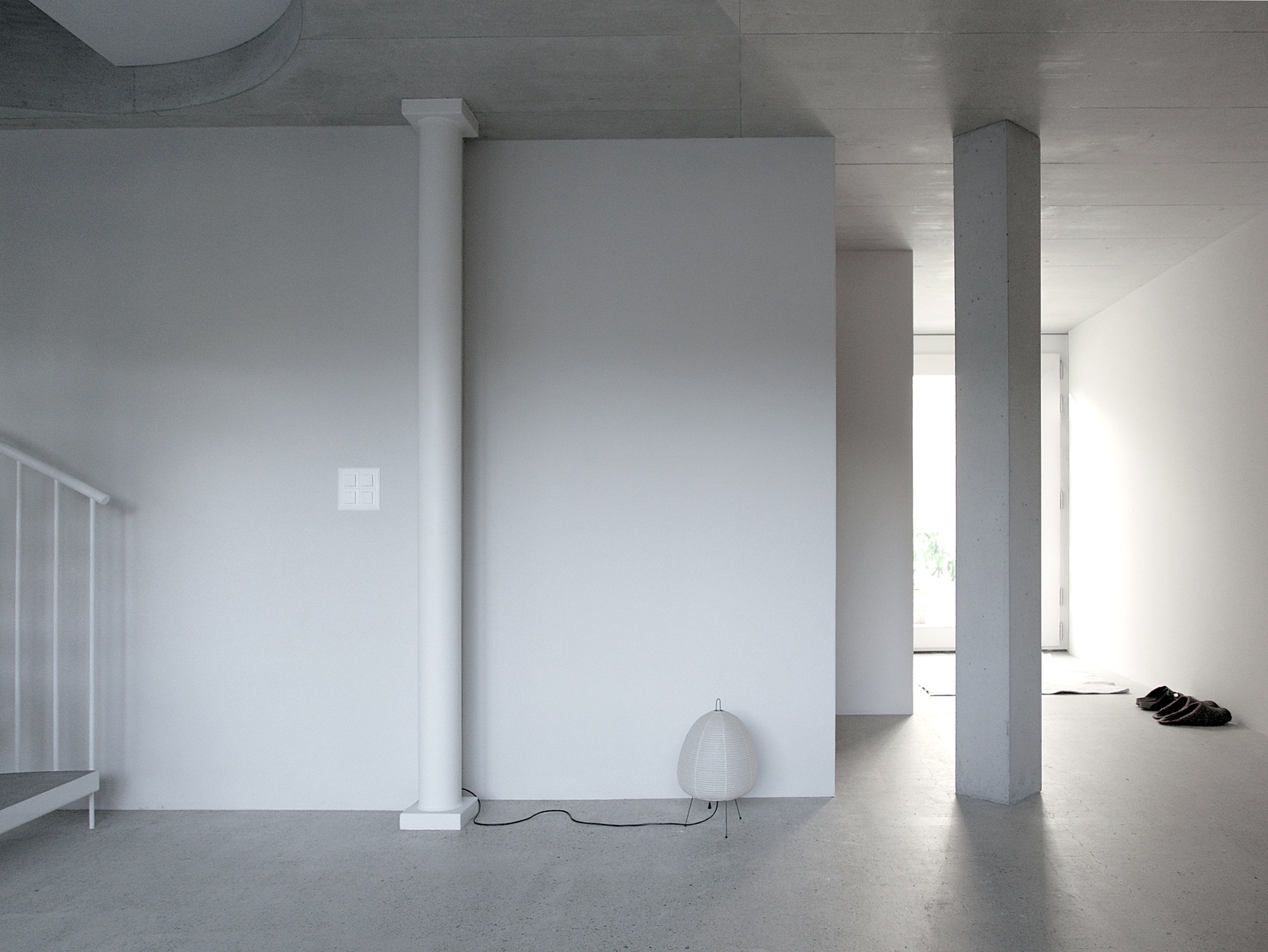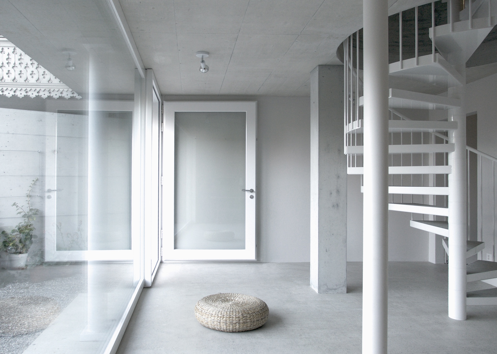 Auf Strassenniveau gibt es keine Hinweise auf ein Haus. Gebaut ist nur eine befahrbare Plattform aus Beton mit einer runden Aussparung, aus der das obere Ende einer Spindeltreppe hinausragt. Die Treppe ist zugleich Erschliessung und Vorraum für das darunterliegende Haus. Eine schlanke Säule mit rotem Anstrich steht symbolisch für das «fehlende» Haus und schafft eine formale Verbindung zum Innenraum.