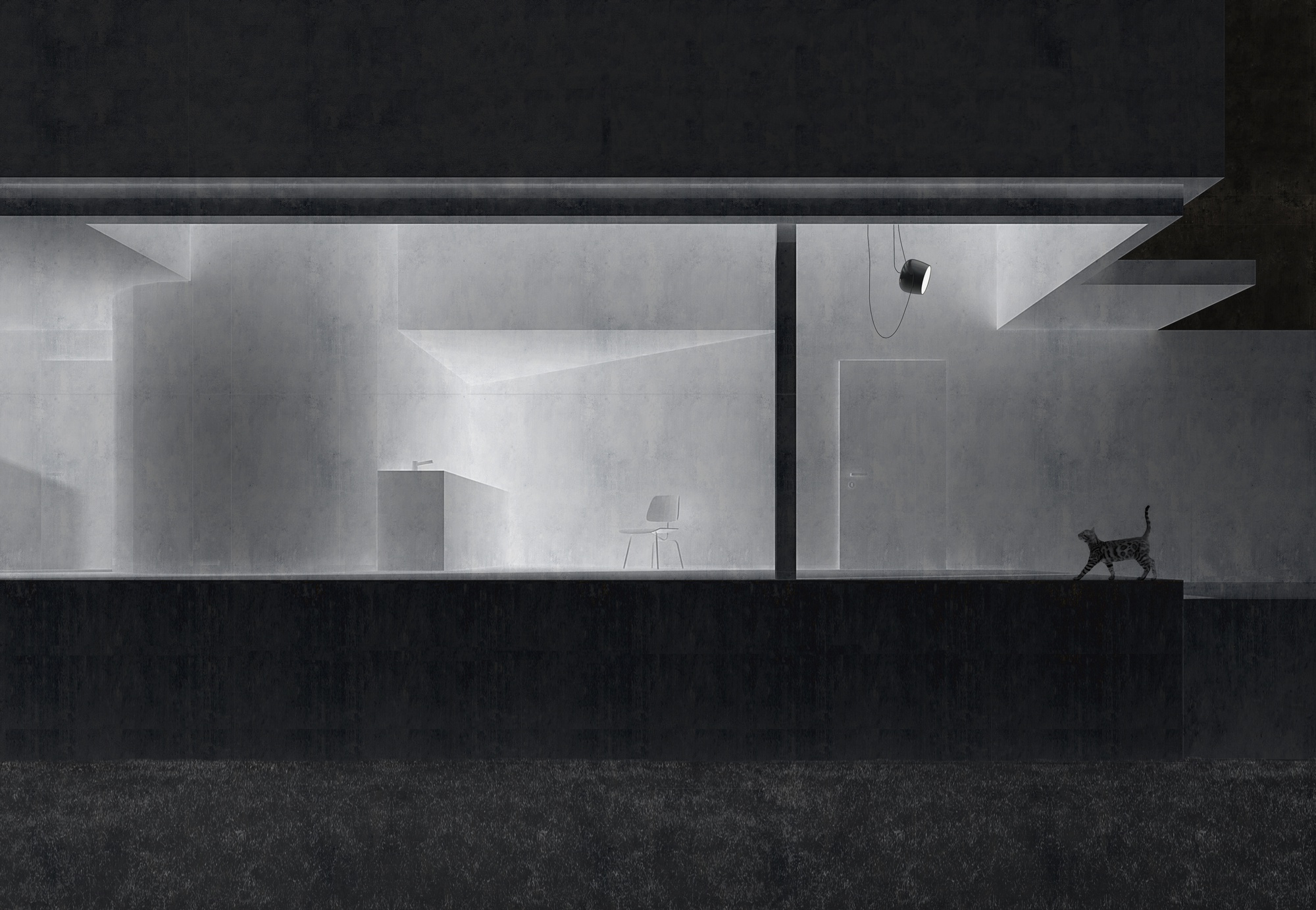 Excerpt from an interview on JAS, by Werk Bauen + Wohnen: «Unterhalb der Plattform, eingebettet im Hang, liegt ein rund 30 Meter langes Wohngeschoss. Mit dem Hinabsteigen verschwindet der Bezug zur Strasse und der unmittelbaren Umgebung. Der Raum hat privaten und schützenden Charakter. Die überraschende Grösse resultiert aus dem systematischen Rückbau sämtlicher nichttragender Bauteile. Die abgetreppte Kontur der Rückwand verdeutlicht die langgezogene Geometrie und verbindet den beheizten Innen- mit dem gedeckten Aussenbereich. Die Südfassade ist durchgehend geöffnet und zur Hälfte verglast, mit Sicht über den Lago di Lugano. Die wechselnden Wetterlagen prägen und verändern den Raum. Ein komplett blau gestrichenes Volumen gliedert den Hauptraum in unterschiedliche Bereiche und bildet ein Zentrum und einen Rückzugsort mit klarer Geometrie und diffusen Konturen. Hier tritt die Architektur zurück und es bleibt die Präsenz des Fernblicks, der Umgebung. Das darunterliegende Geschoss ist über eine interne Treppe erreichbar und verfügt über drei Schlafzimmer.»