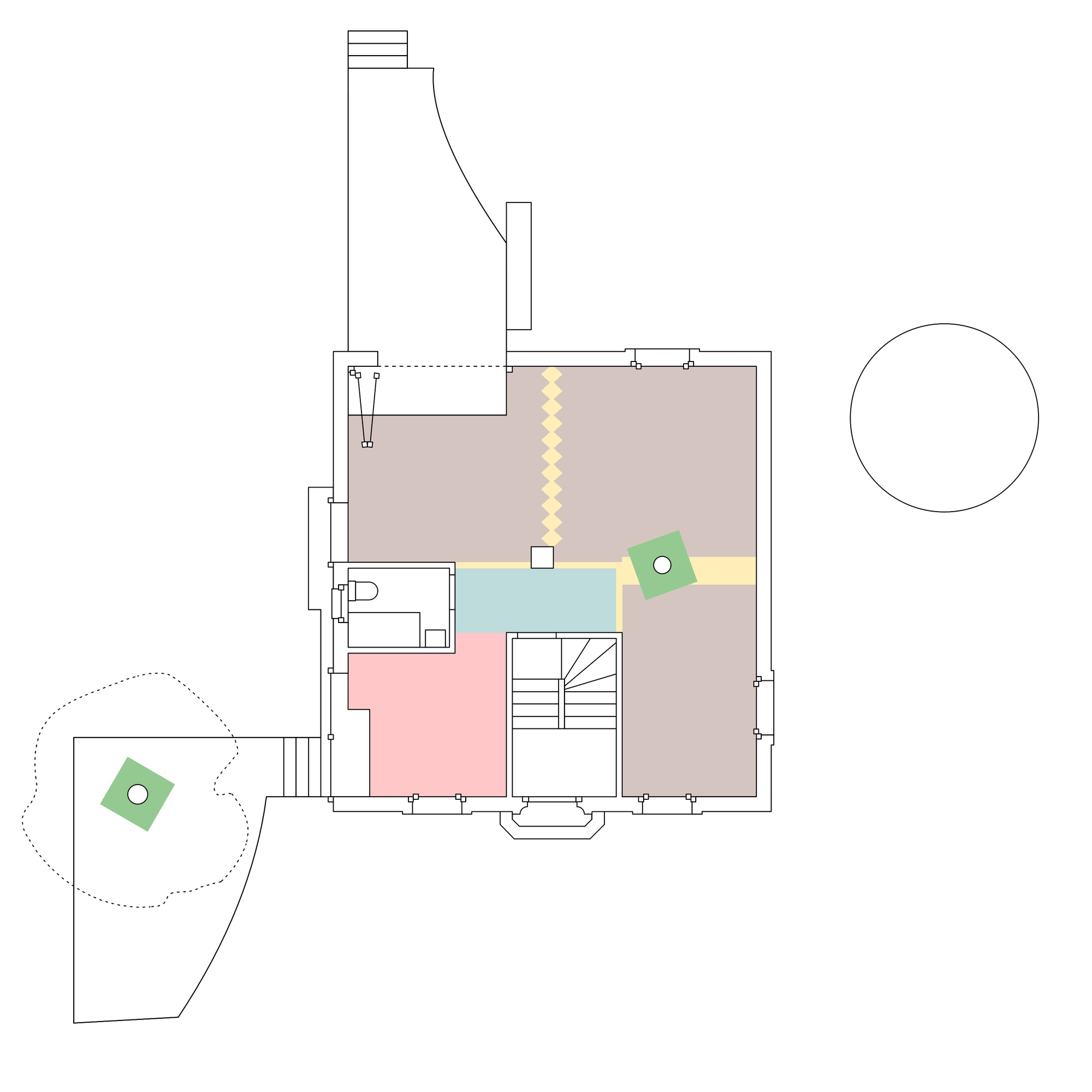 Renovation of a three storey house from the ’30s. The ground floor expends to the garden with large concrete basis. Inside, the division walls are removed to create an open space: an area for all the inhabitants of the house. A pattern of different floors characterise and structures the new common space.