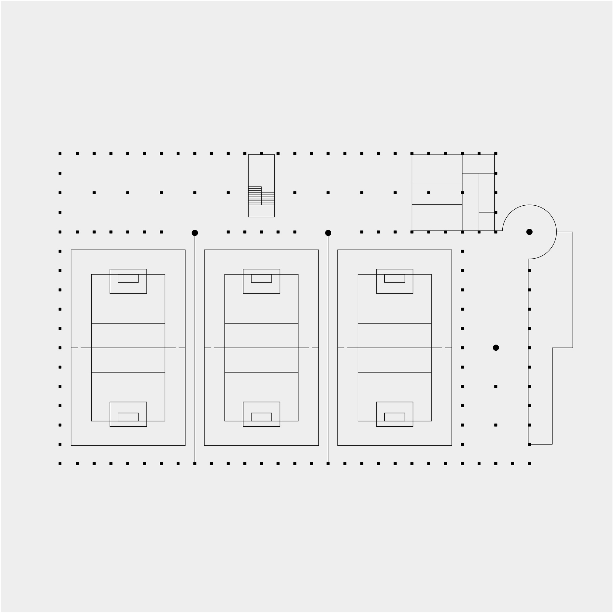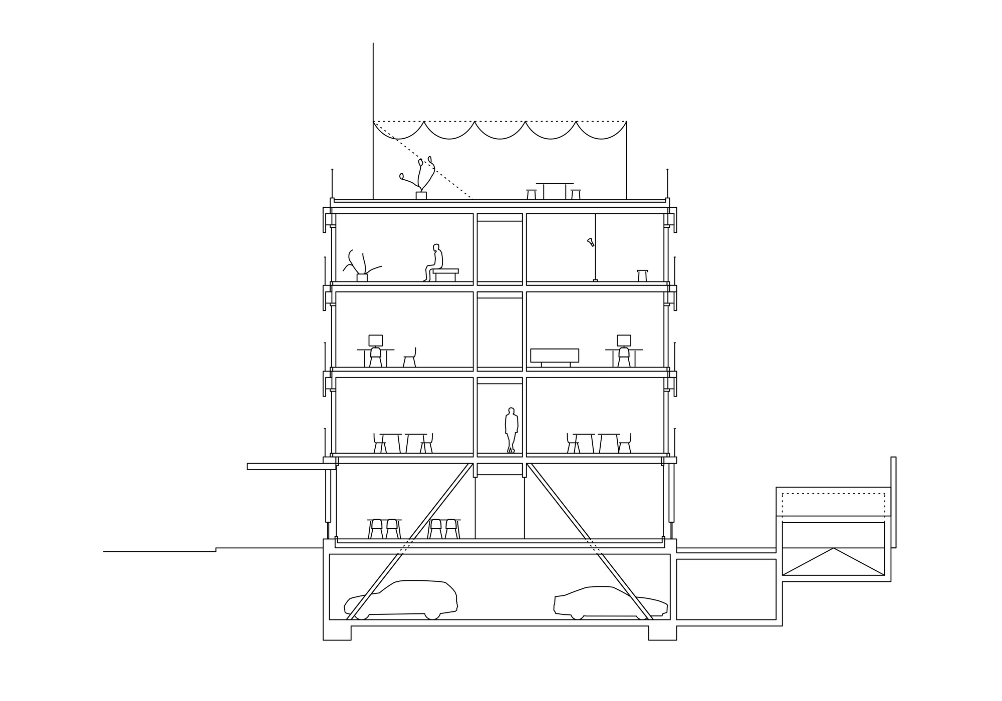 Above ground, the building hosts semi-public spaces, offices and small apartments. In these floors, perimeter brick walls and a central concrete corridor provide linear supports with reduced static spans.