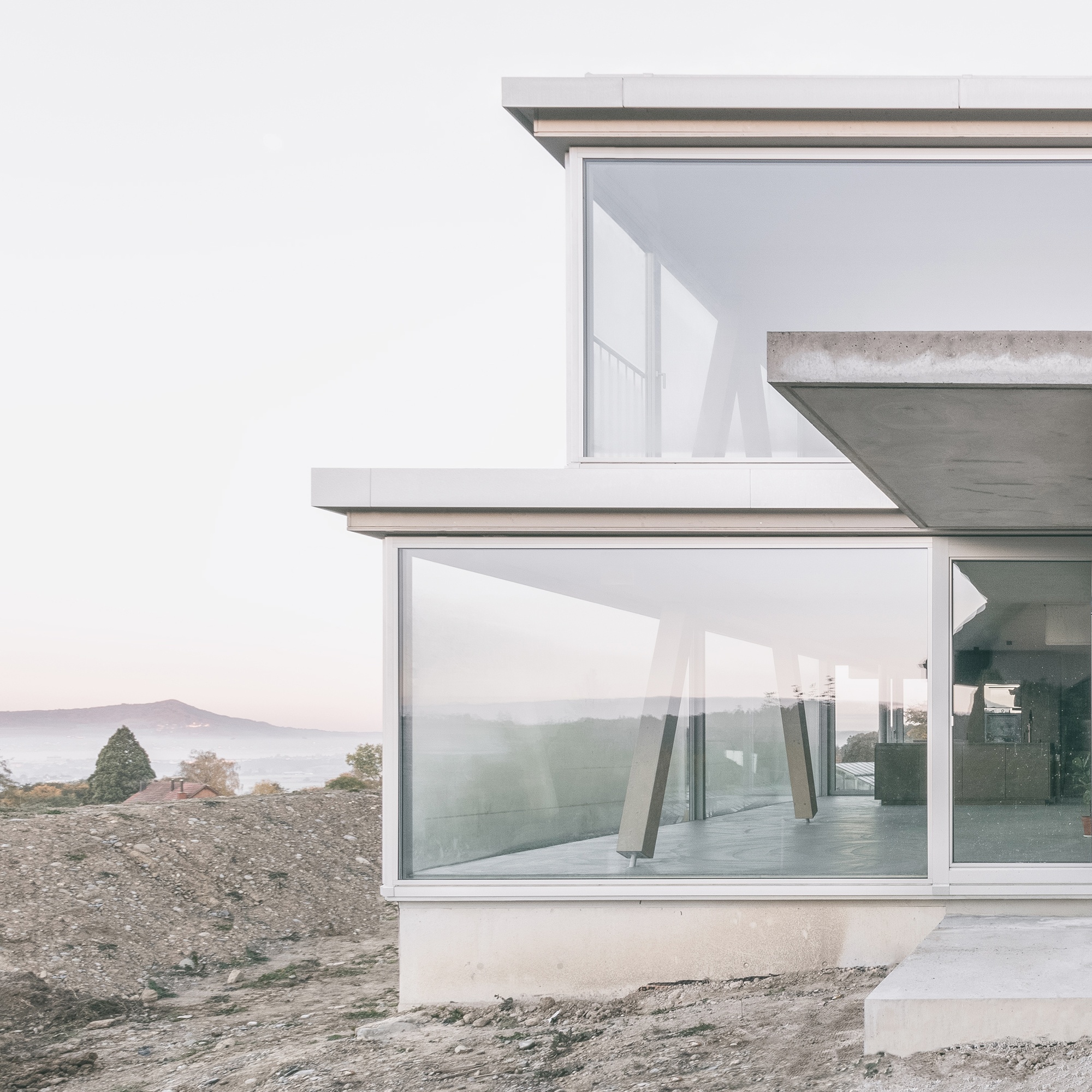 Located in a village overlooking the airport of Zurich, the project consists of a concrete basis placed in a gentle slope. An open wooden structure develops over two floors, creating a sequence of rooms facing every side of the building lot.