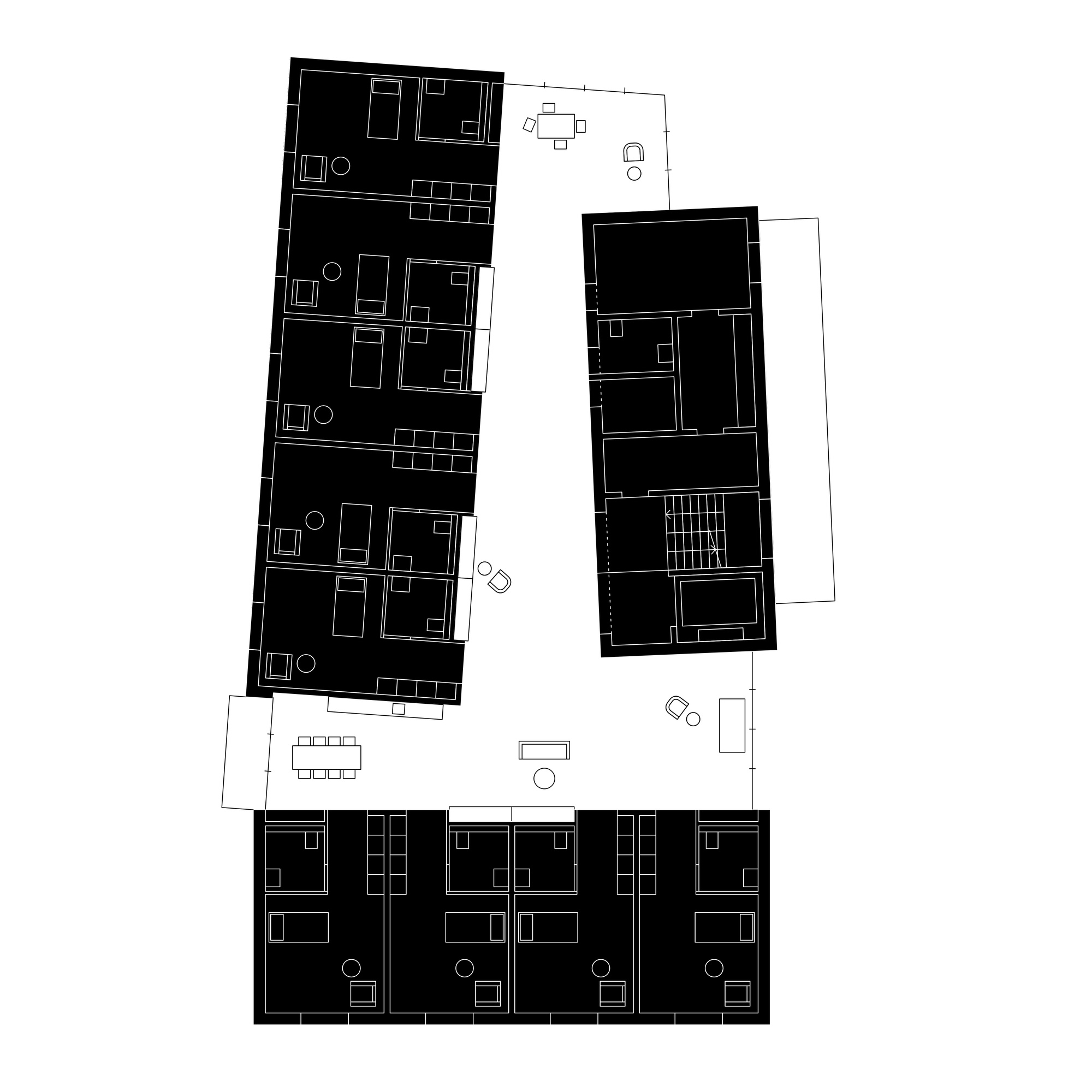 Above ground, the building hosts semi-public spaces, offices and small apartments. In these floors, perimeter brick walls and a central concrete corridor provide linear supports with reduced static spans.