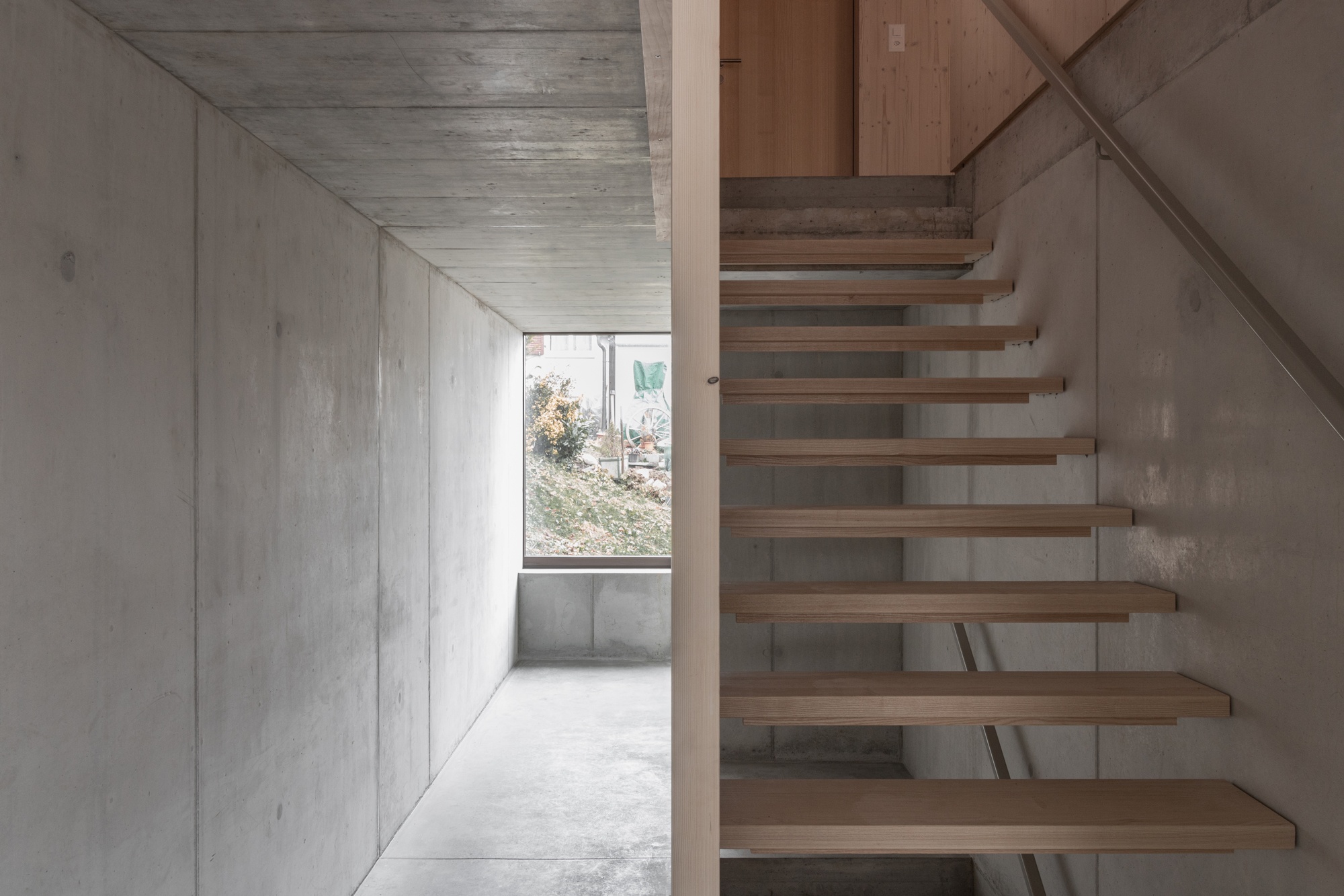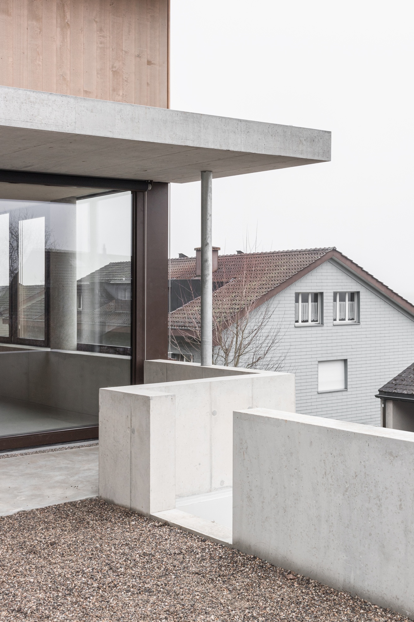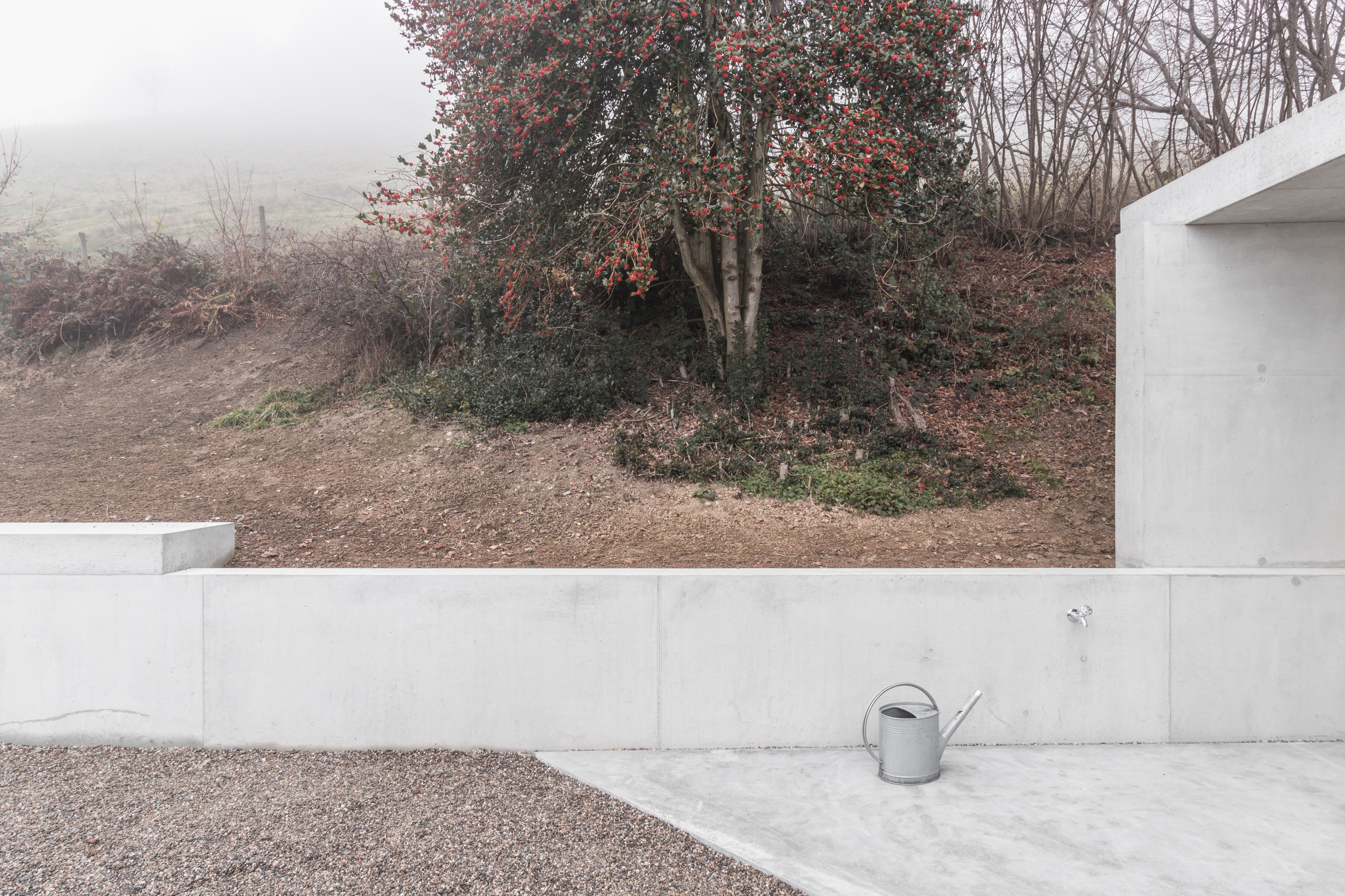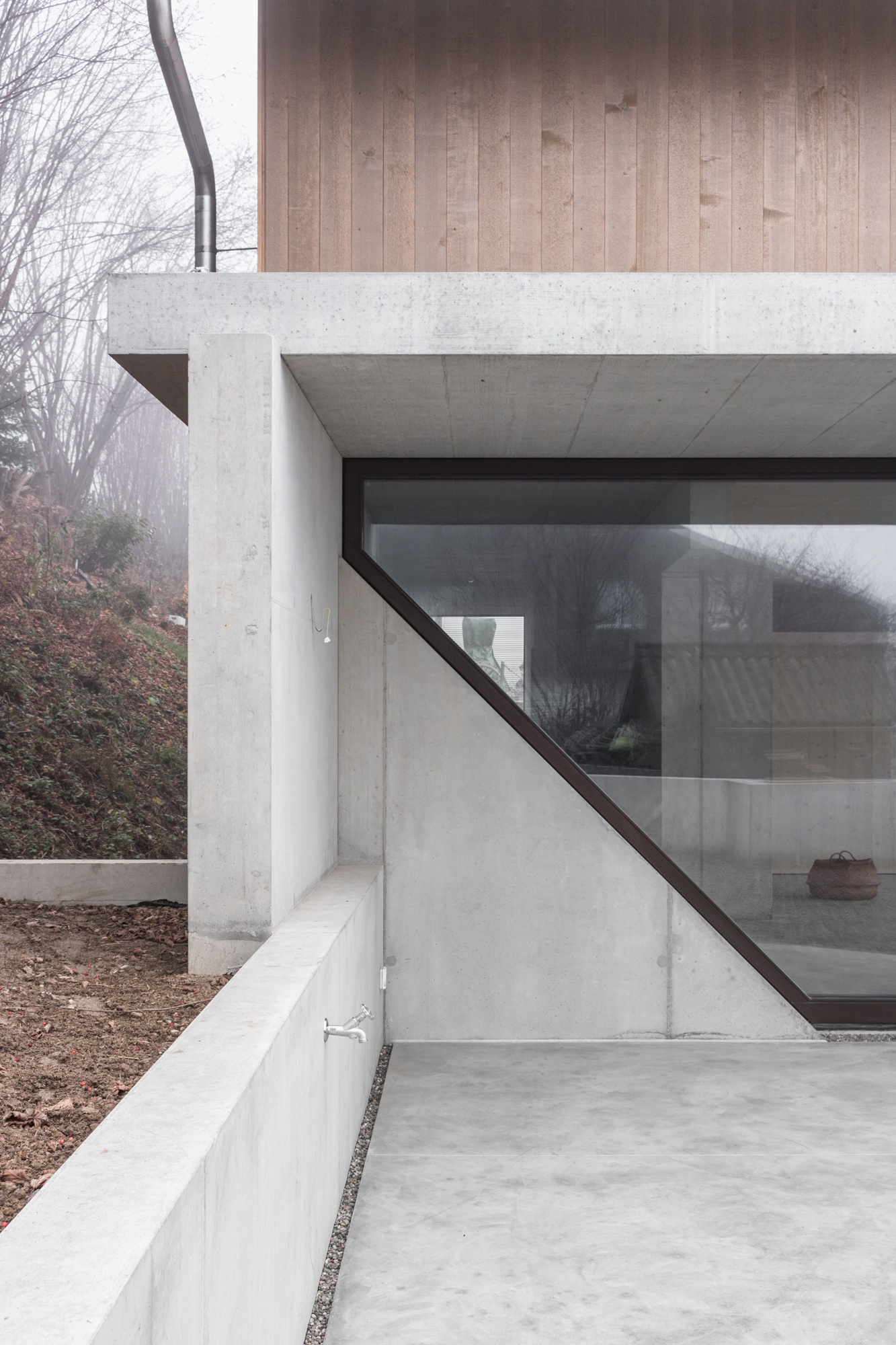 The site lies on a strong slope, in an area considered by the authorities to be in danger of landslides. An existing house of the 60’s has been demolished until the basement. The new house consists of three floors stacked on each other: the levels offer very different characters of space and material. The main living floor is characterized by a concrete wall protects and defines the house and the sitting area outside. Through this gesture, the living room appears much larger than it is actually build.