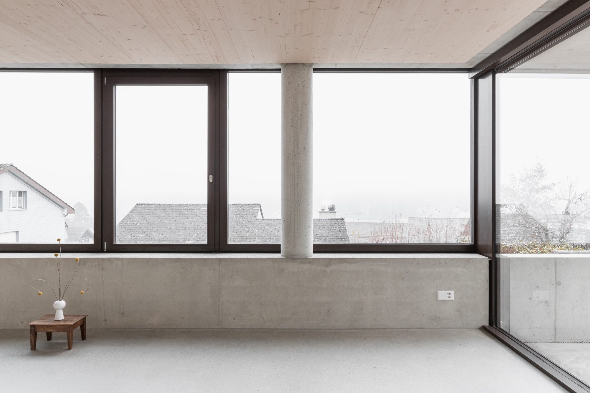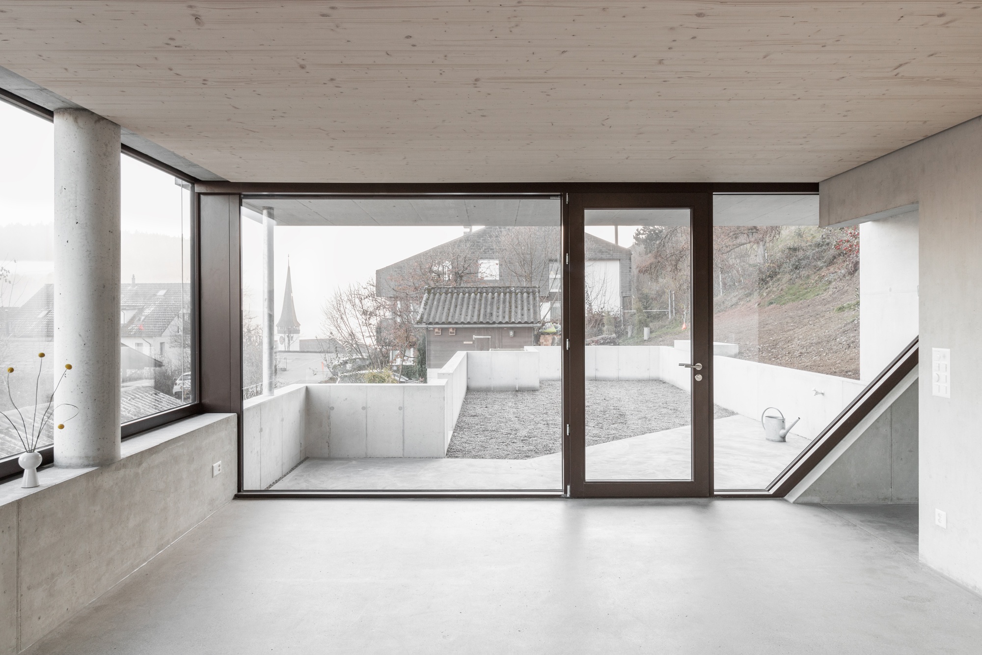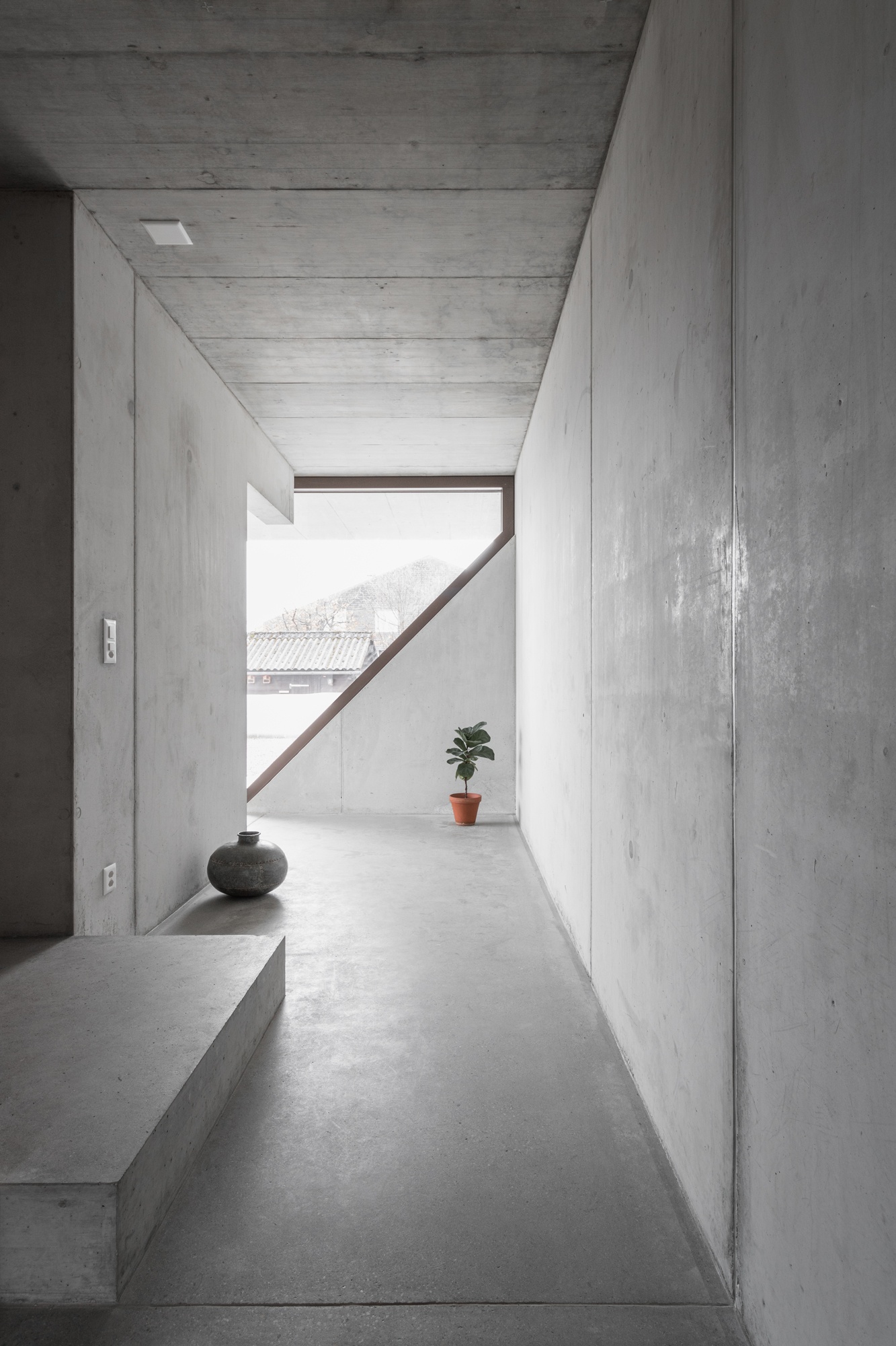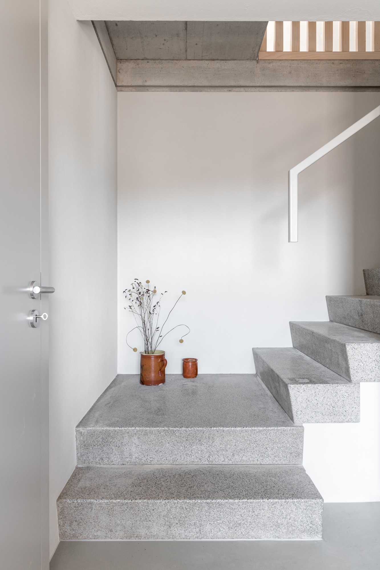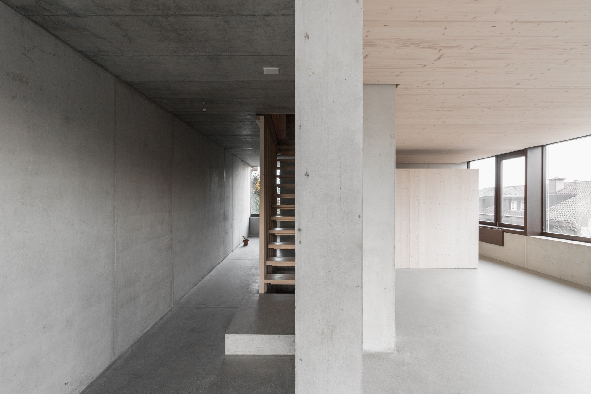 The site lies on a strong slope, in an area considered by the authorities to be in danger of landslides. An existing house of the 60’s has been demolished until the basement. The new house consists of three floors stacked on each other: the levels offer very different characters of space and material. The main living floor is characterized by a concrete wall protects and defines the house and the sitting area outside. Through this gesture, the living room appears much larger than it is actually build.
