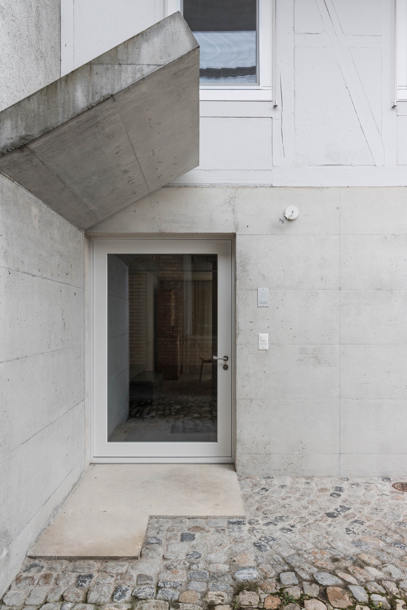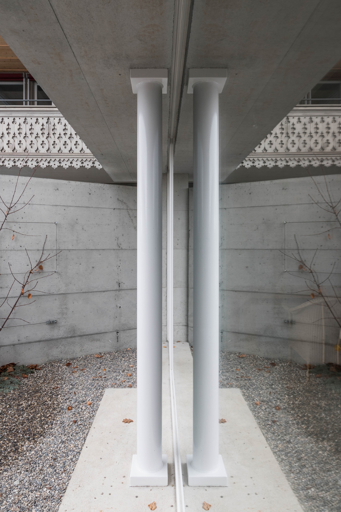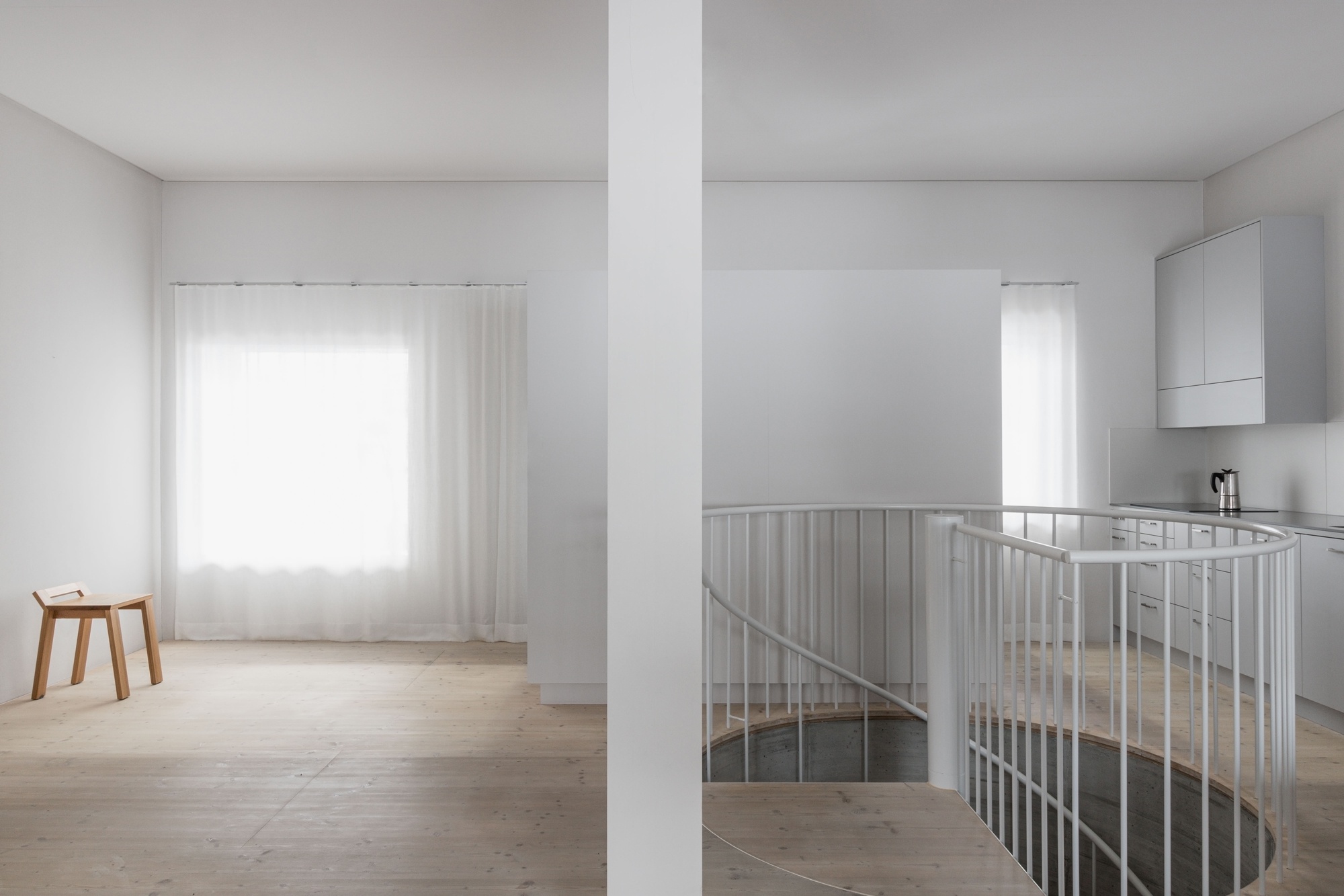The interior of the existing, protected building was completely emptied and filled by a new structure. Placed without apparent order, several structural elements characterise the ground floor. To fully understand the system is necessary to experience the whole, three-story house.