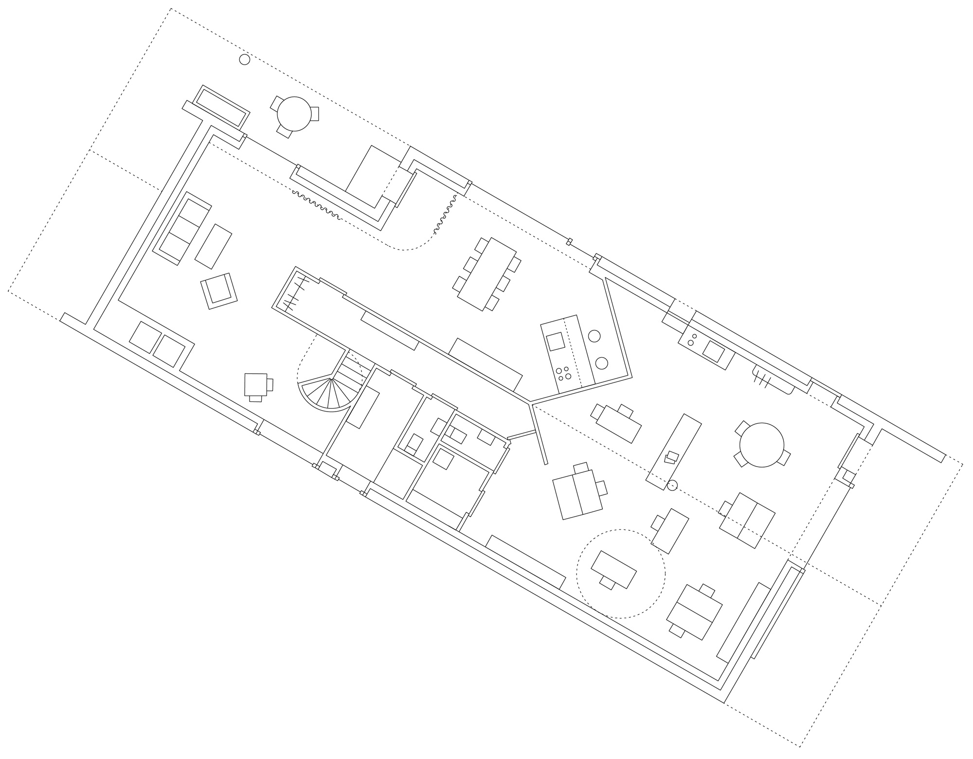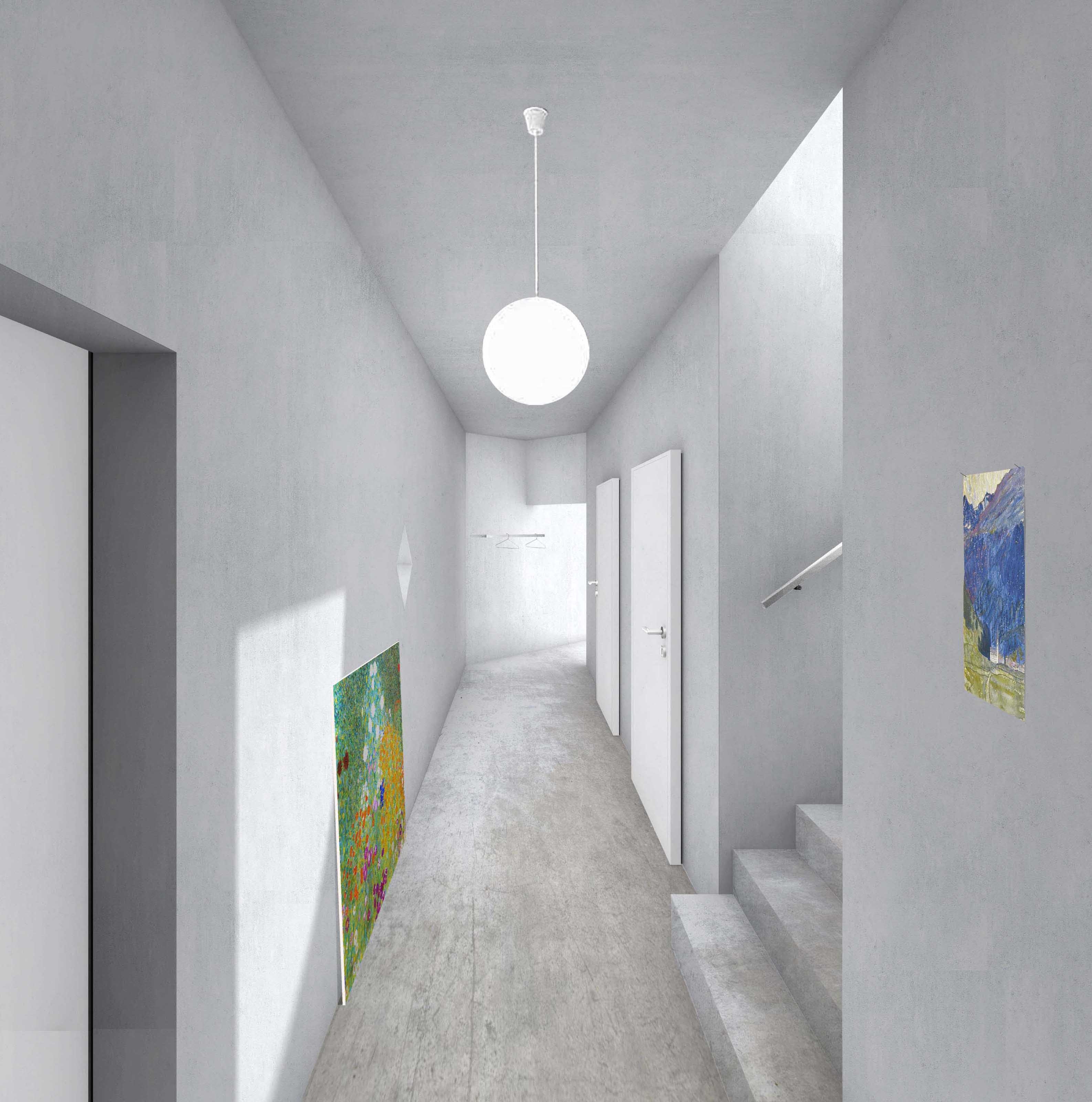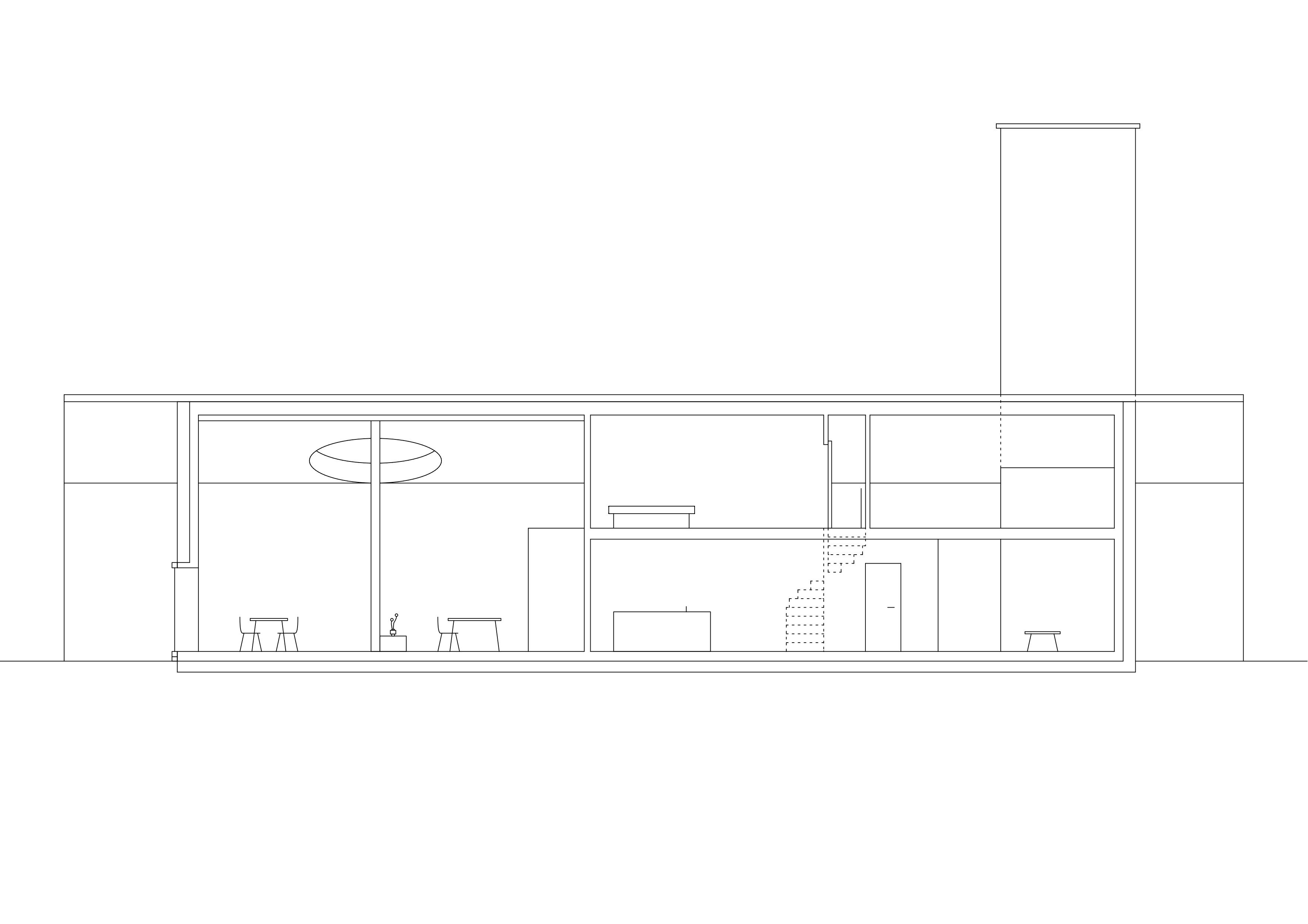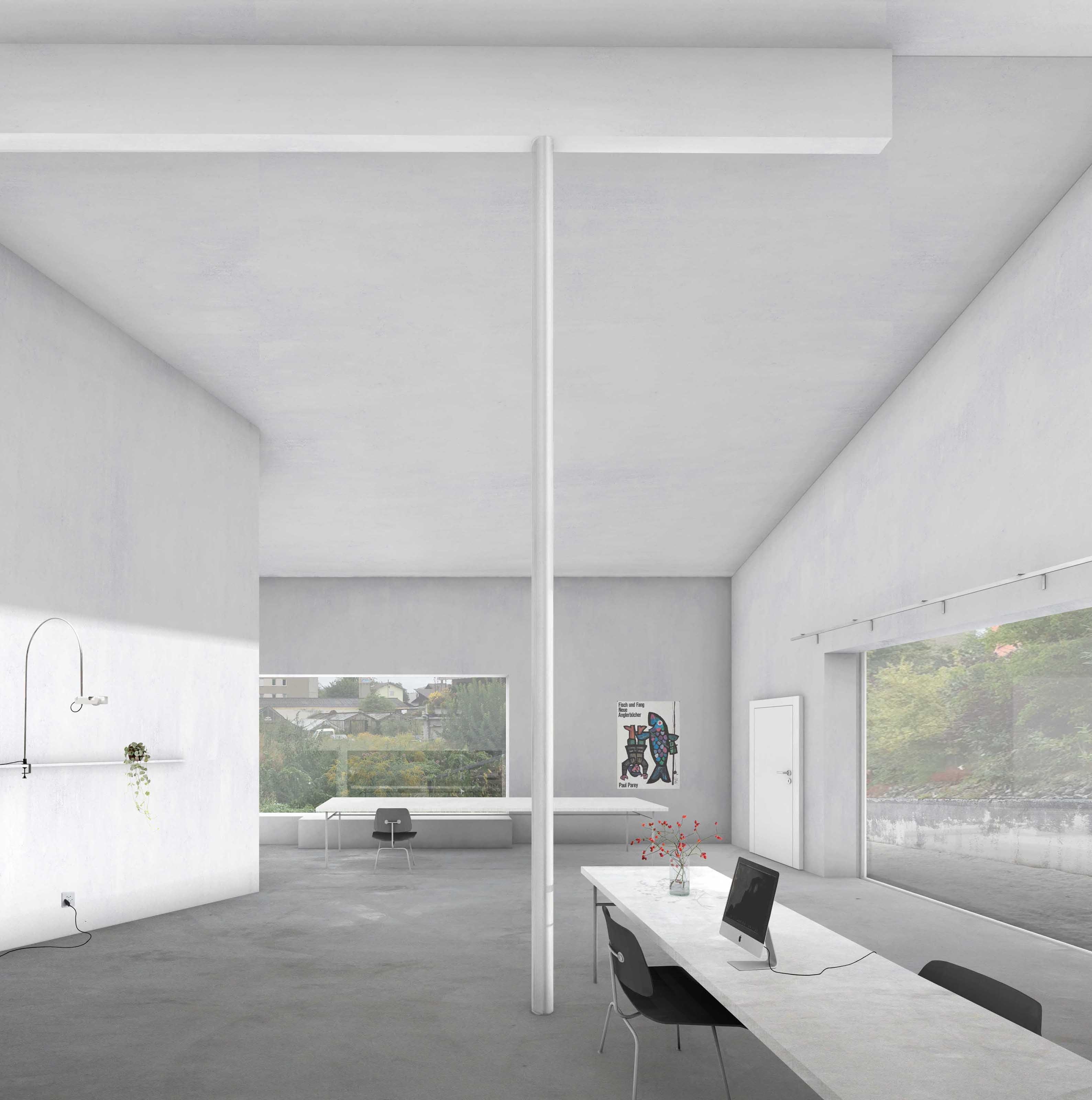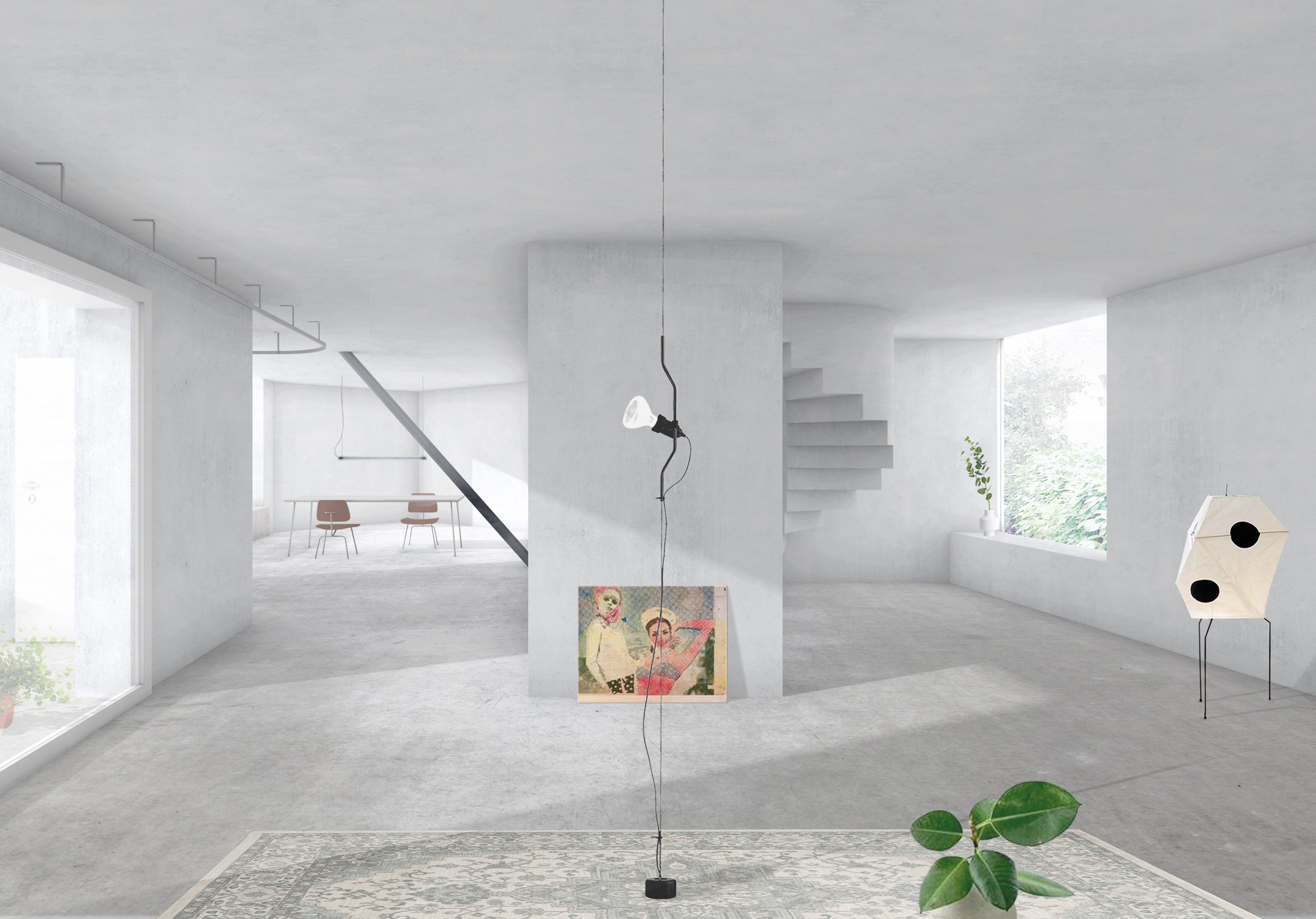 Under one roof, the existing hall will accomodate a living area and an office area for a young family and their business. A sculptural circulation core divides two, drastically different spaces: a square, high room for the office and an horizontal, narrow room for the house.