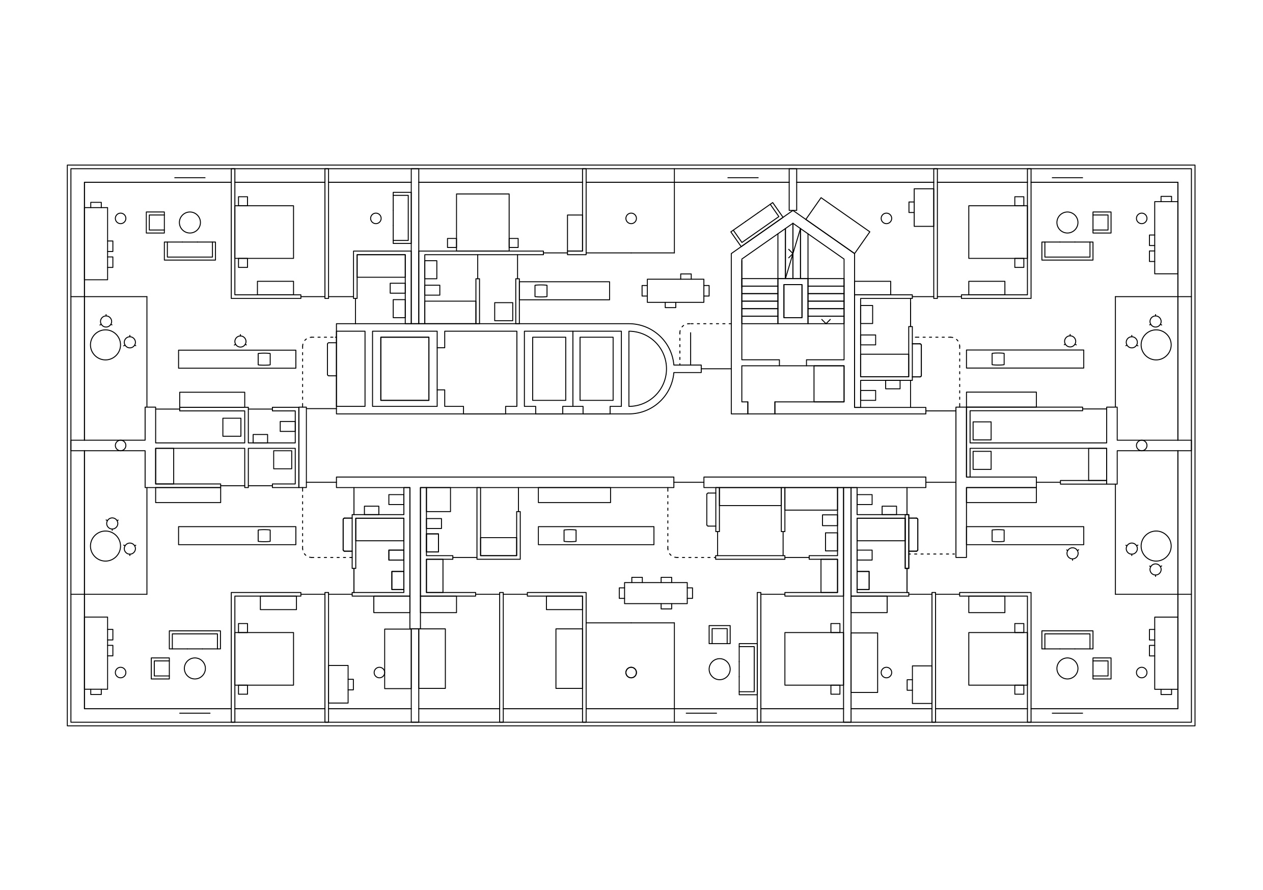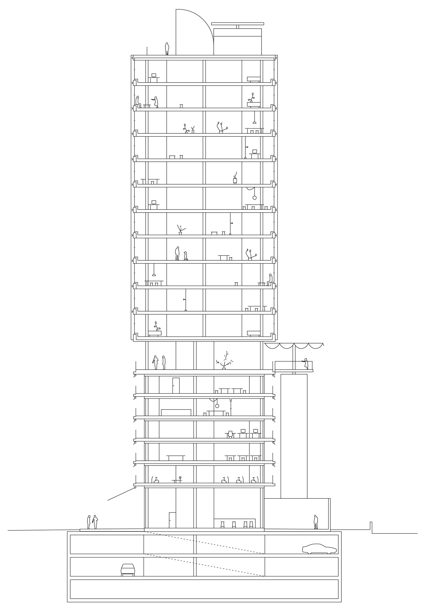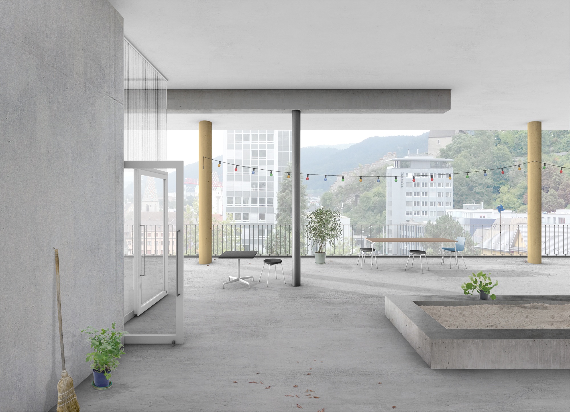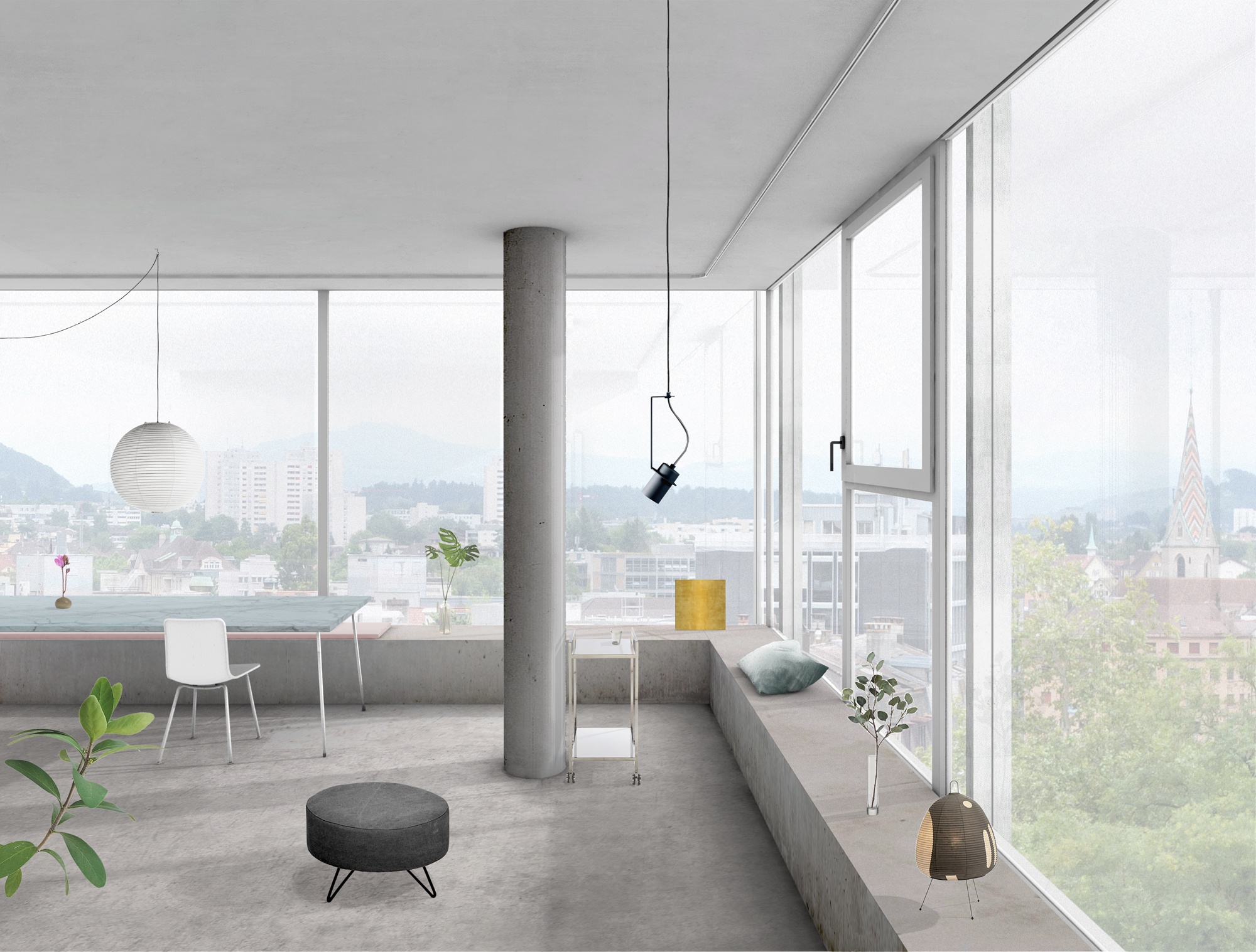 Placed along a main street leading into Baden, the multifunctional tower marks the limit between the agglomeration an the city center. The lower part of the building relates to the urban structure, offering flexible spaces for offices and various public functions. With its top part, fitting 11 floors of apartments, the 70m high tower acts as a new landmark for the city. An open floor marks the gap between the two parts of the tower, offering a space for recreation to the inhabitants.